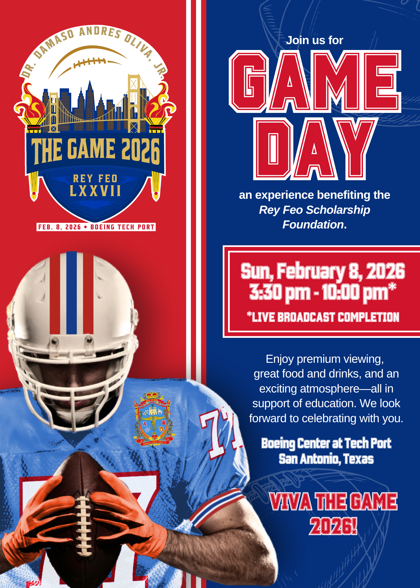Get ready for the return of San Antonio’s most anticipated event of the season—THE GAME 2026 with Rey Feo LXXVII, Dr. Damaso Andres Oliva, Jr. Join us for an electrifying day of excitement, community, and purpose as we come together to watch the ultimate gridiron showdown on the big screen.